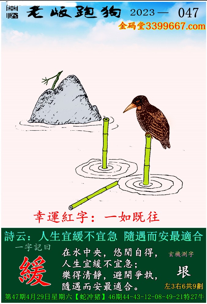 | 主题 : 047期老版跑狗一字記之曰:【緩】 玄機測字:《垠》 |