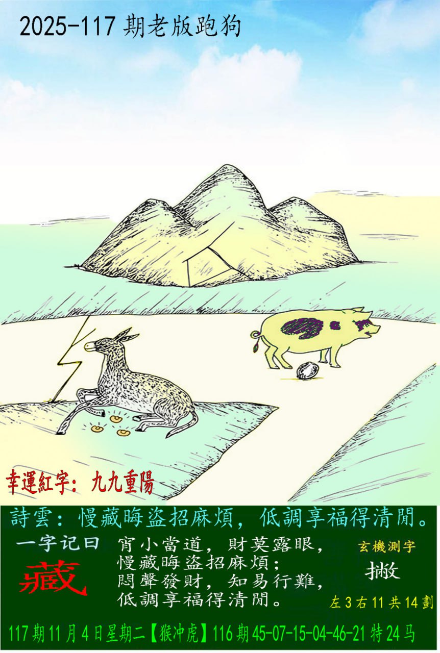 | 主题 :117期老版跑狗一字記之曰:【藏】 玄機測字:《撇》 |