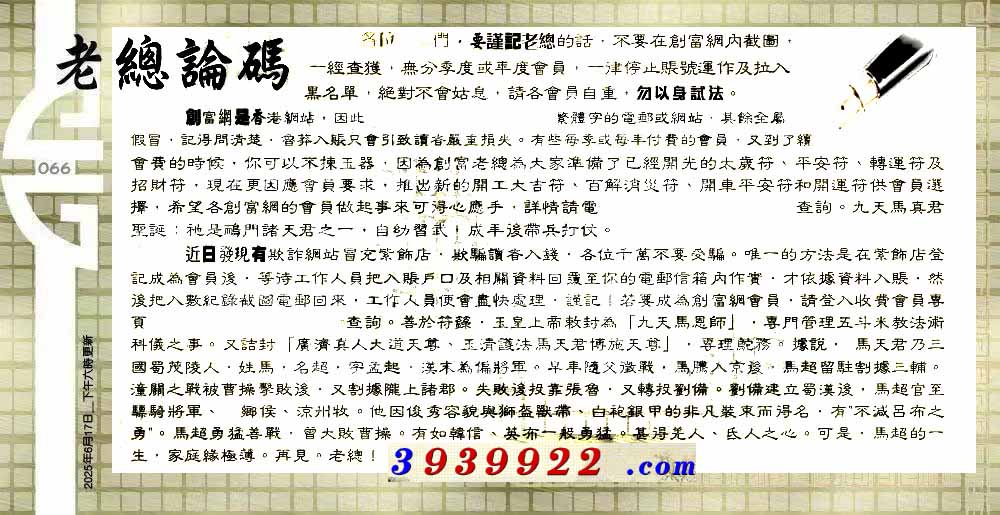 | 主题 :066期:六合皇金句/老总论码/萧公子/林大师/五行夺码/老总信箱截 |