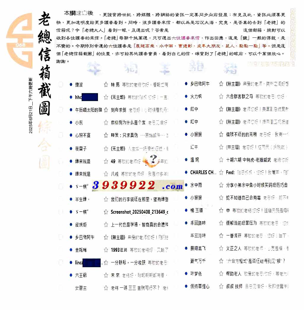 | 主题 :068期:六合皇金句/老总论码/萧公子/林大师/五行夺码/老总信箱截 |