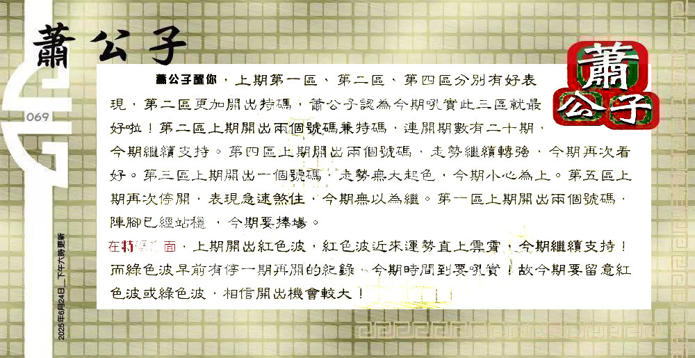 | 主题 :069期:六合皇金句/老总论码/萧公子/林大师/五行夺码/老总信箱截 |