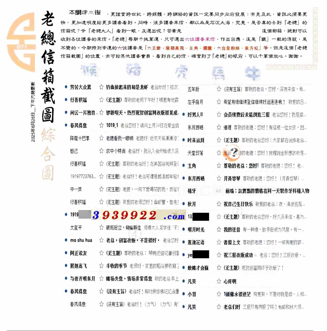 | 主题 :071期:六合皇金句/老总论码/萧公子/林大师/五行夺码/老总信箱截 |