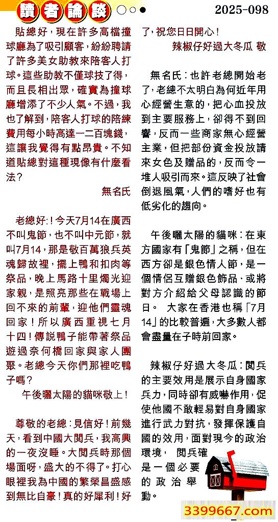 | 主题 :098期:彩民推荐〖貼信讀者論壇〗 |