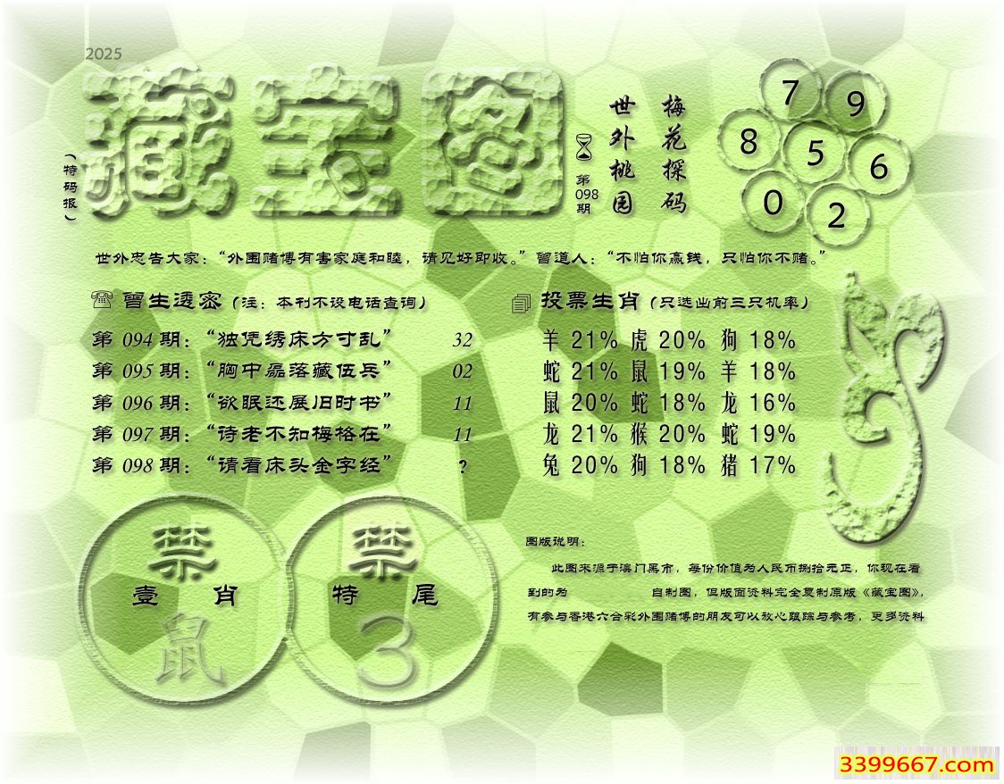 主题 :098期藏寶圖 新:寸肠争奈此情何 老:请看床头金字经 禁:鼠 禁:3尾 |