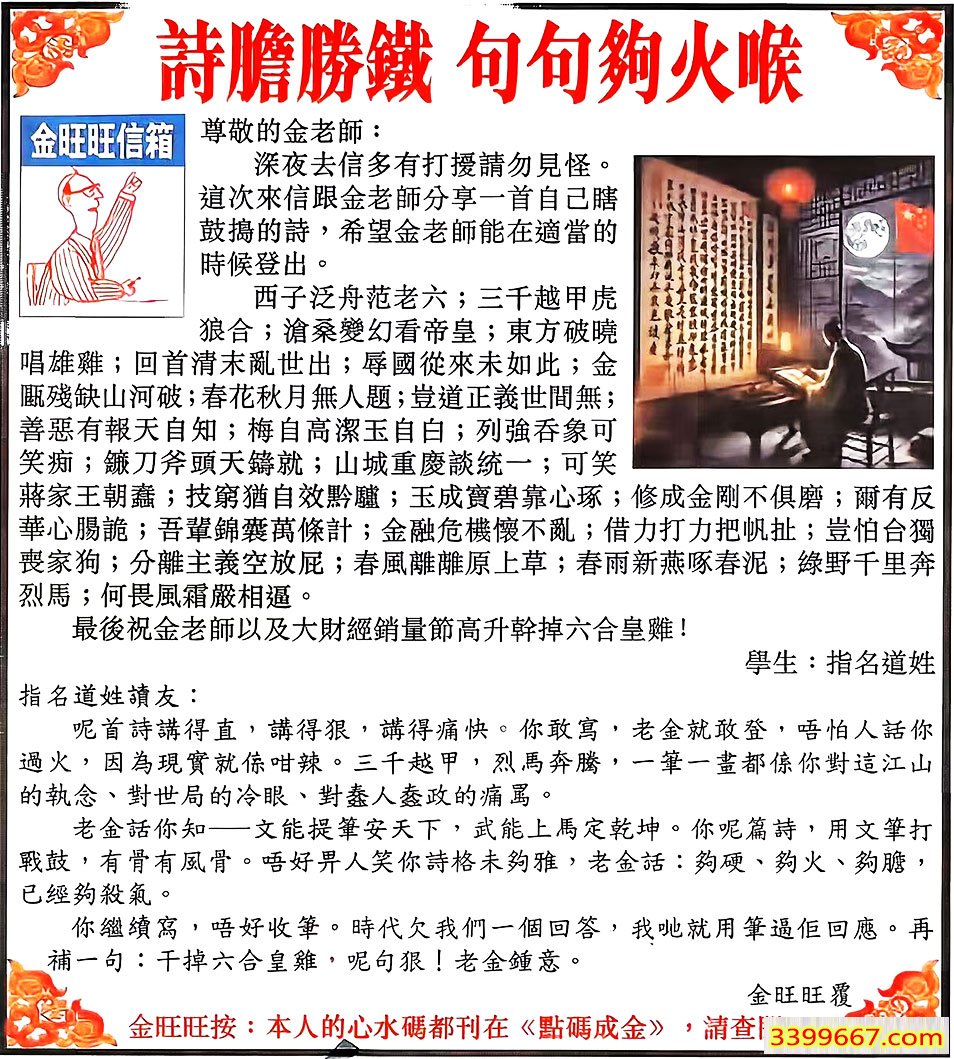 主题 :111期:金旺旺信箱彩民推荐→→《詩膽勝鐵 句句夠火候》 |