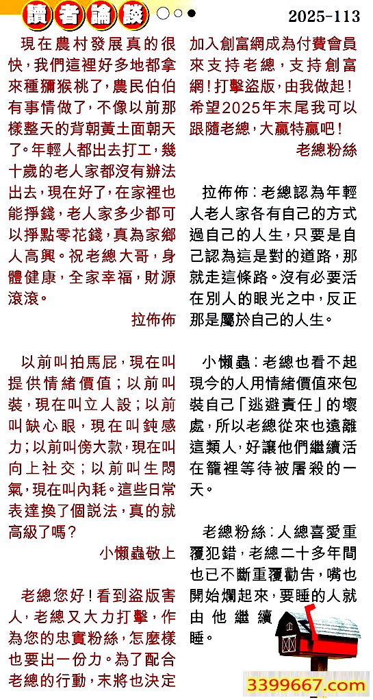 主题 :113期:彩民推荐〖貼信讀者論壇〗 |