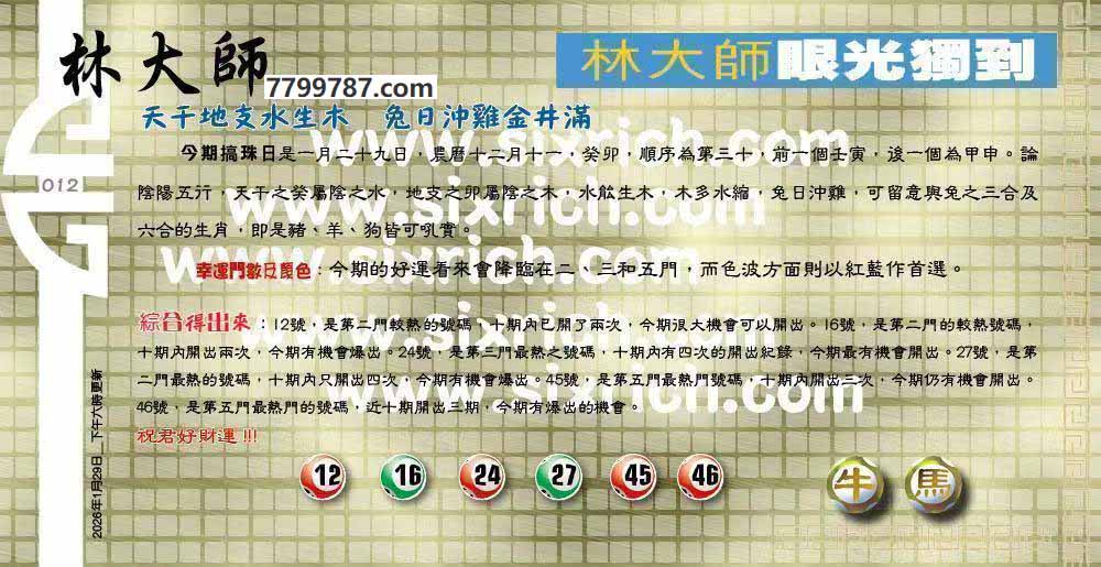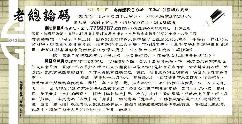 | 主题 :012期:六合皇金句/老总论码/萧公子/林大师/五行夺码/老总信箱截 |