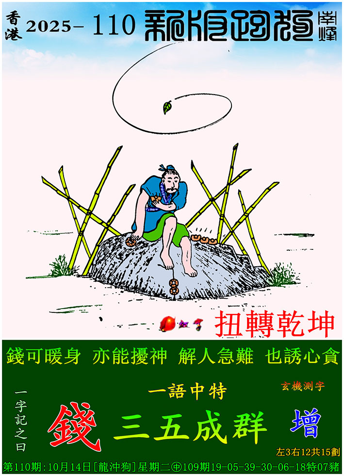 主题 :110期:新版跑狗一字記之曰【錢】 玄機測字:【增】 |